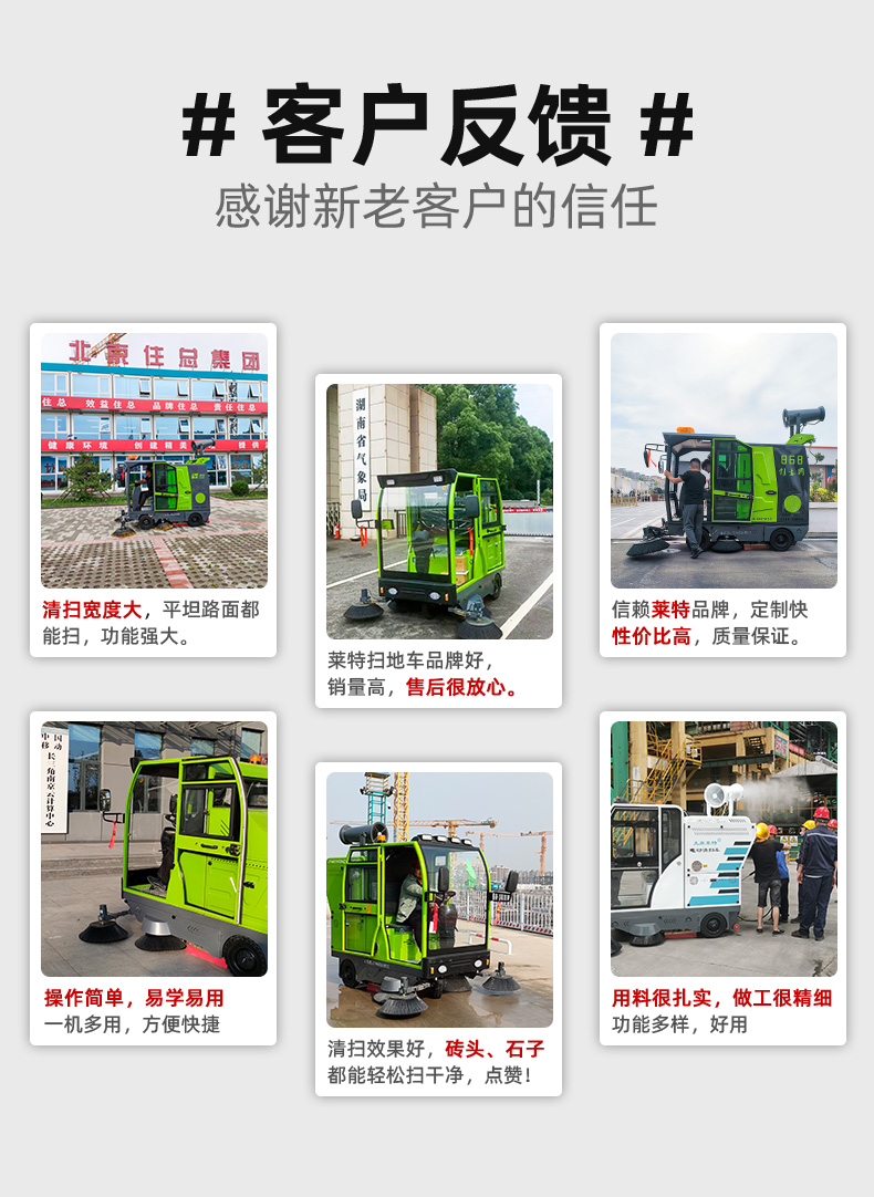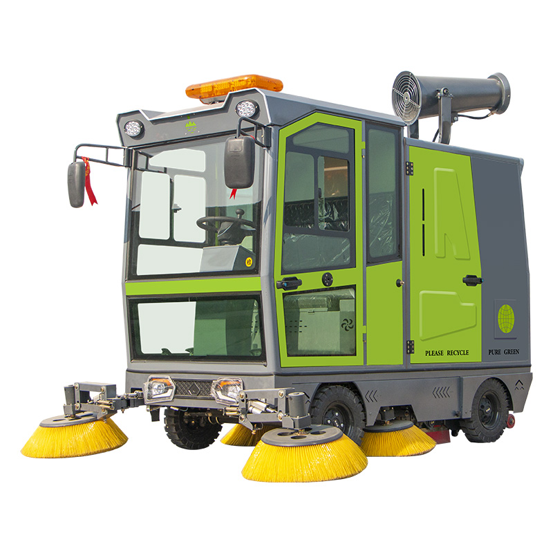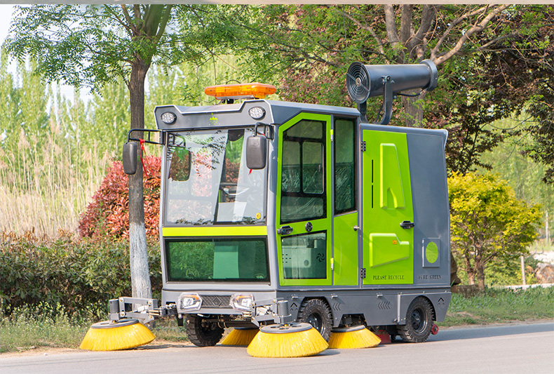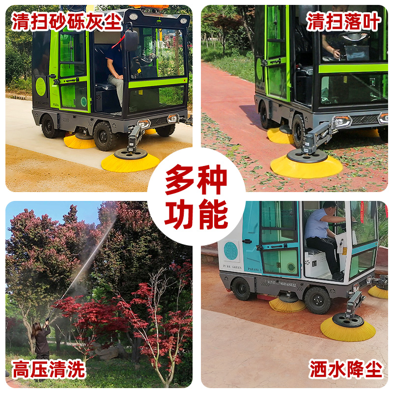 莱特LT-G50型全封闭四轮驾驶式扫地车,配备高压清洗和高压雾炮功能,清扫宽度2500mm,满电工作时间为6-8小时,工作效率25000㎡/h,采用的是8*200A免维护铅酸电池,高压雾炮射程可达10米以上,可对作业环境高效的降尘,还可以用于绿植养护和环境消杀。高压水枪可以对地面顽固污渍进行清洁,还可以冲洗路牙石,为绿植浇水,工作之余,还可以用高压水枪清洗车辆。应用场景为:厂区、车间、公园、街道、物业小区、码头、学校、机场、停车场、地下车库、充电站、加油站、公园工厂、工业园区等需要大面积清扫的区域区域。