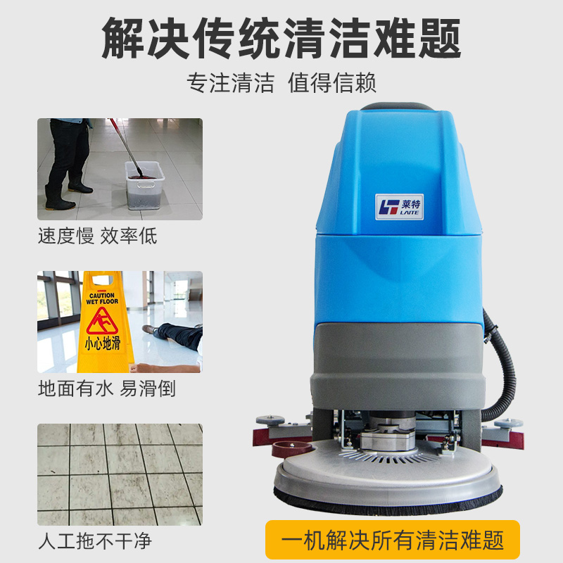 莱特LT-M2型手推式工业洗地机,工作效率2300㎡/h,清洗宽度530mm,吸水宽度800mm,电池容量24V/100Ah,采用大功率品牌电机,广泛用于工厂、车间、医院、商场、机场、地下车库等场景,洗刷吸三合一,去污不留痕,充满电可以连续工作2-3小时,适用于6000㎡左右的工作场地。