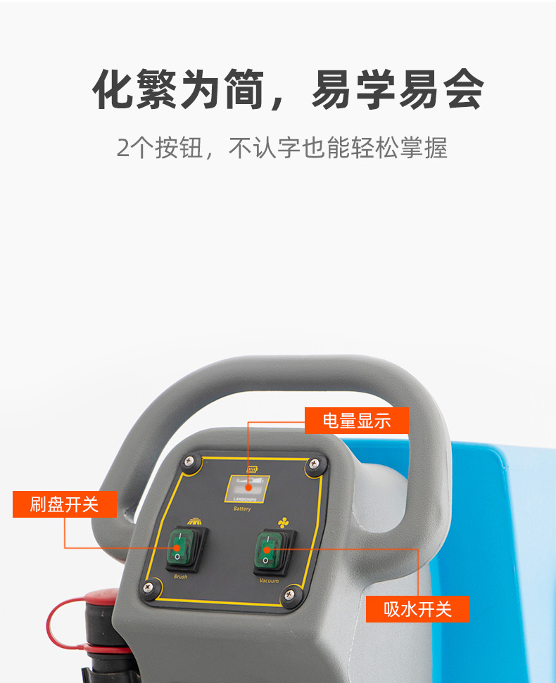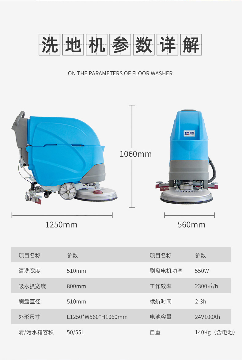 LT-M2型手推式工业洗地机,工作效率2300㎡/h,清洗宽度530mm,吸水宽度800mm,电池容量24V/100Ah,采用大功率品牌电机,广泛用于工厂、车间、医院、商场、机场、地下车库等场景,洗刷吸三合一,去污不留痕,充满电可以连续工作2-3小时,适用于6000㎡左右的工作场地。